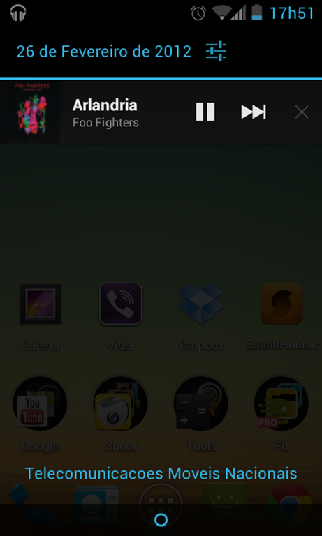 Igualmente, com música em reprodução, a barra de notificação conta com uma entrada persistente que, para além de mostrar a capa do álbum e controlos de reprodução, permite aceder à aplicação de música. Esta adição à barra de notificação eliminou, no meu caso, a necessidade de qualquer tipo dewidget para controlo de música.